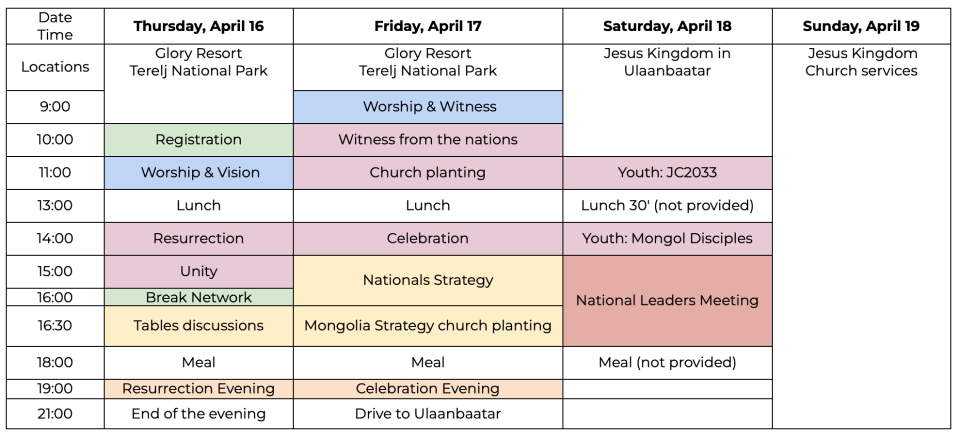 The Asia Gathering begins on Thursday, April 16 at 11 a.m. at Glory Resort, Terelj National Park (1 hours from Ulaanbaatar).
